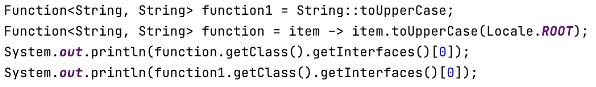 public class Test3 { public static void main(String[] args) { TheInterface1 t1 = () -> {}; TheInterface2 t2 = () -> {}; System.out.println(t1.getClass().getInterfaces()[0]); System.out.println(t2.getClass().getInterfaces()[0]); } } @FunctionalInterface interface TheInterface1{ void myMethod1(); } interface TheInterface2{ void myMethod2(); }