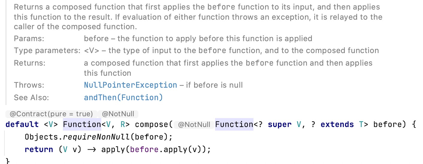 /** * Returns a composed(组合) function that first applies the {@code before} * function to its input, and then applies this function to the result. * If evaluation(计算) of either function throws an exception, it is relayed to * the caller of the composed function. * * @param <V> the type of input to the {@code before} function, and to the * composed function * @param before the function to apply before this function is applied * @return a composed function that first applies the {@code before} * function and then applies this function * @throws NullPointerException if before is null * * @see #andThen(Function) */