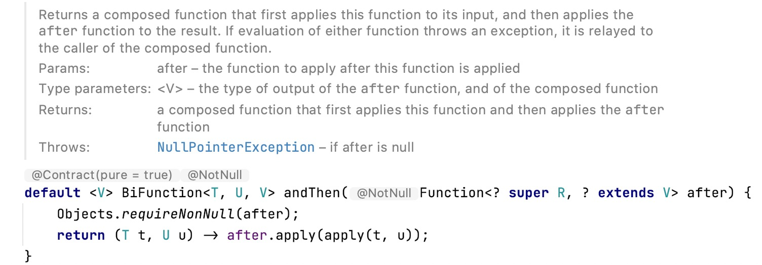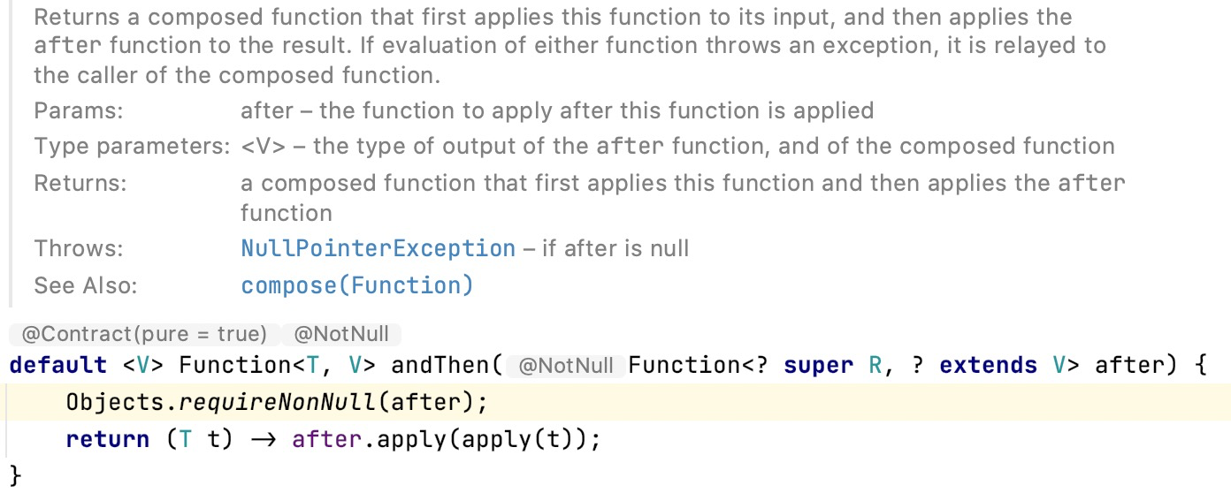 /** * Returns a composed function that first applies this function to * its input, and then applies the {@code after} function to the result. * If evaluation of either function throws an exception, it is relayed to * the caller of the composed function. * * @param <V> the type of output of the {@code after} function, and of the * composed function * @param after the function to apply after this function is applied * @return a composed function that first applies this function and then * applies the {@code after} function * @throws NullPointerException if after is null */