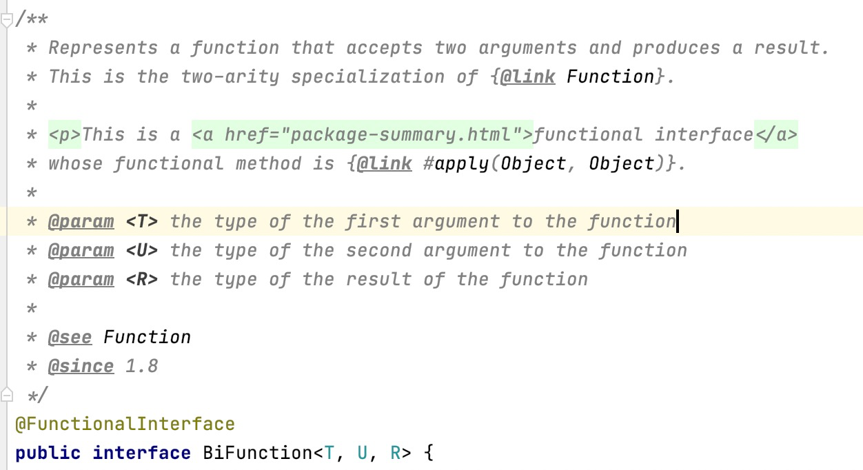 /** * Represents a function that accepts two arguments and produces a result. * This is the two-arity specialization(两个参数的特例) of {@link Function}. * * <p>This is a <a href="package-summary.html">functional interface</a> * whose functional method is {@link #apply(Object, Object)}. * * @param <T> the type of the first argument to the function * @param <U> the type of the second argument to the function * @param <R> the type of the result of the function * * @see Function * @since 1.8 */