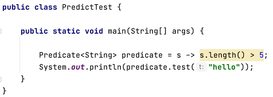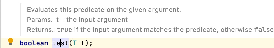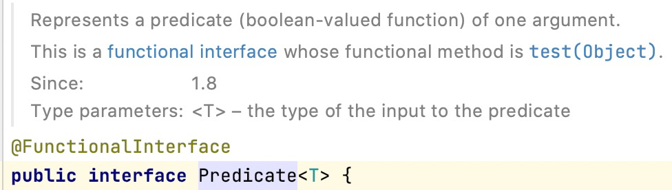 /** * Represents a predicate (boolean-valued function) of one argument. * * <p>This is a <a href="package-summary.html">functional interface</a> * whose functional method is {@link #test(Object)}. * * @param <T> the type of the input to the predicate * * @since 1.8 */
