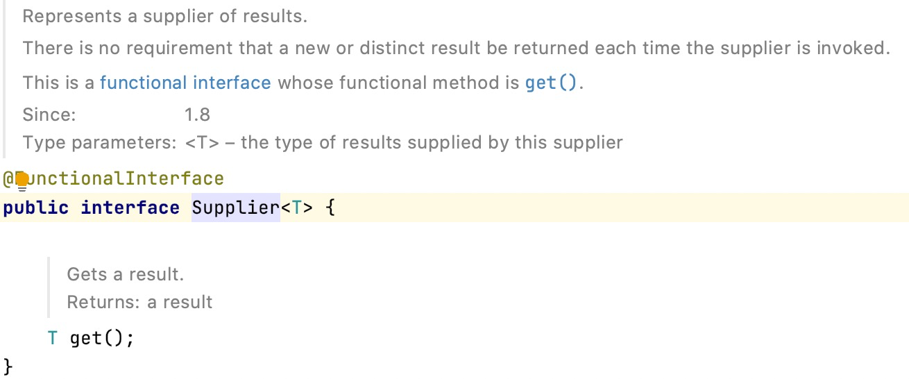 /** * Represents a supplier(供应者) of results. * * <p>There is no requirement that a new or distinct result be returned each * time the supplier is invoked. * * <p>This is a <a href="package-summary.html">functional interface</a> * whose functional method is {@link #get()}. * * @param <T> the type of results supplied by this supplier * * @since 1.8 */