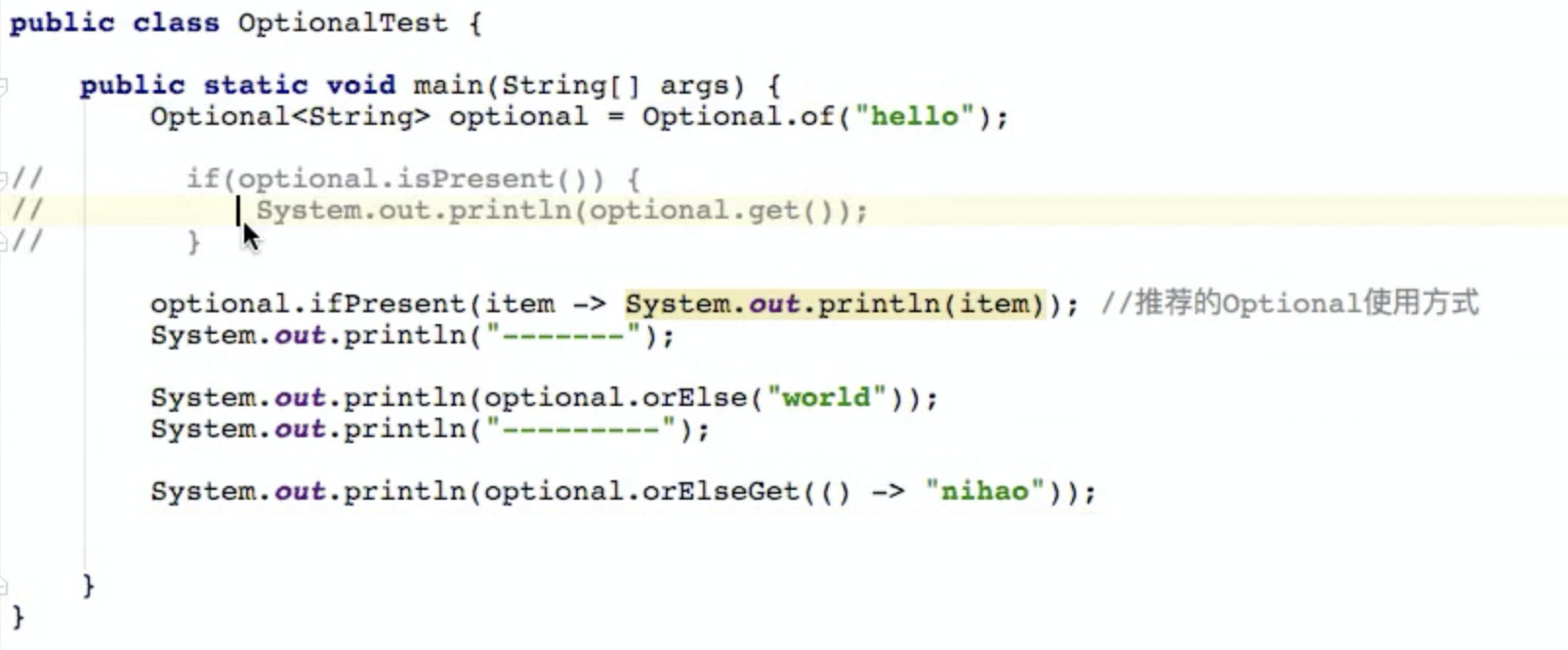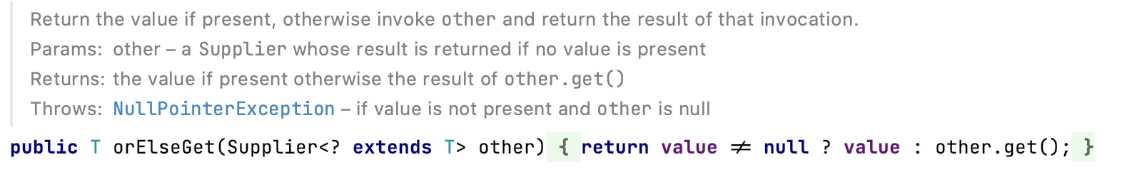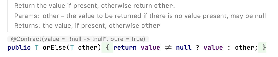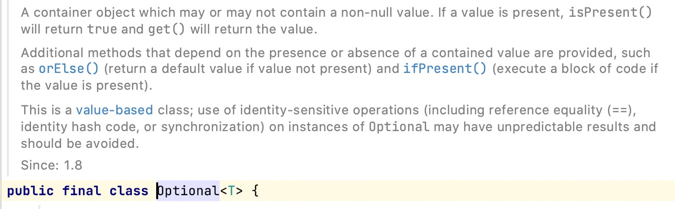 /** * A container object(容器对象) which may or may not contain a non-null value. * If a value is present, {@code isPresent()} will return {@code true} and * {@code get()} will return the value. * * <p>Additional methods that depend on the presence or absence of a contained * value are provided, such as {@link #orElse(java.lang.Object) orElse()} * (return a default value if value not present) and * {@link #ifPresent(java.util.function.Consumer) ifPresent()} (execute a block * of code(执行代码块) if the value is present). * * <p>This is a <a href="../lang/doc-files/ValueBased.html">value-based</a> * class; use of identity-sensitive operations (including reference equality * ({@code ==}), identity hash code, or synchronization) on instances of * {@code Optional} may have unpredictable results and should be avoided. * * @since 1.8 */