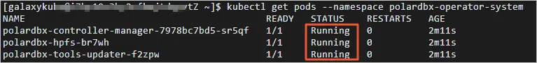 - 执行如下命令,查看PolarDB-X Operator组件的运行情况。