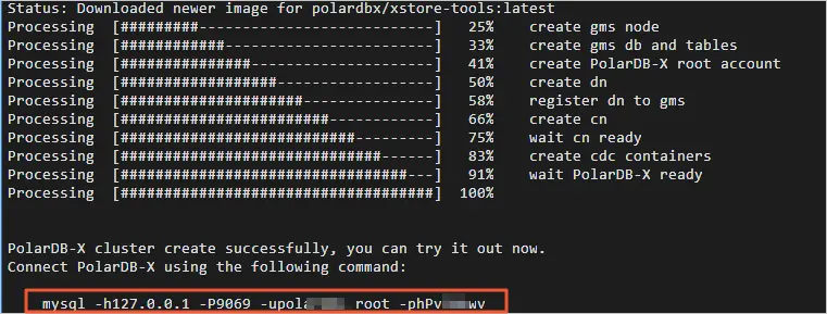 返回结果如下,表示您已成功部署PolarDB-X数据库,您可以看到输出的连接信息,通过MySQL Client即可连接。