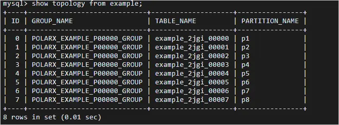 返回结果如下,您可以看到example数据表分布在8个分区。
