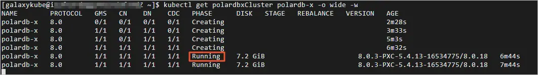 返回结果如下,请您耐心等待大约七分钟,当PHASE显示为Running时,表示PolarDB-X集群已经部署完成。现在您可以开始连接并体验PolarDB-X分布式数据库了。