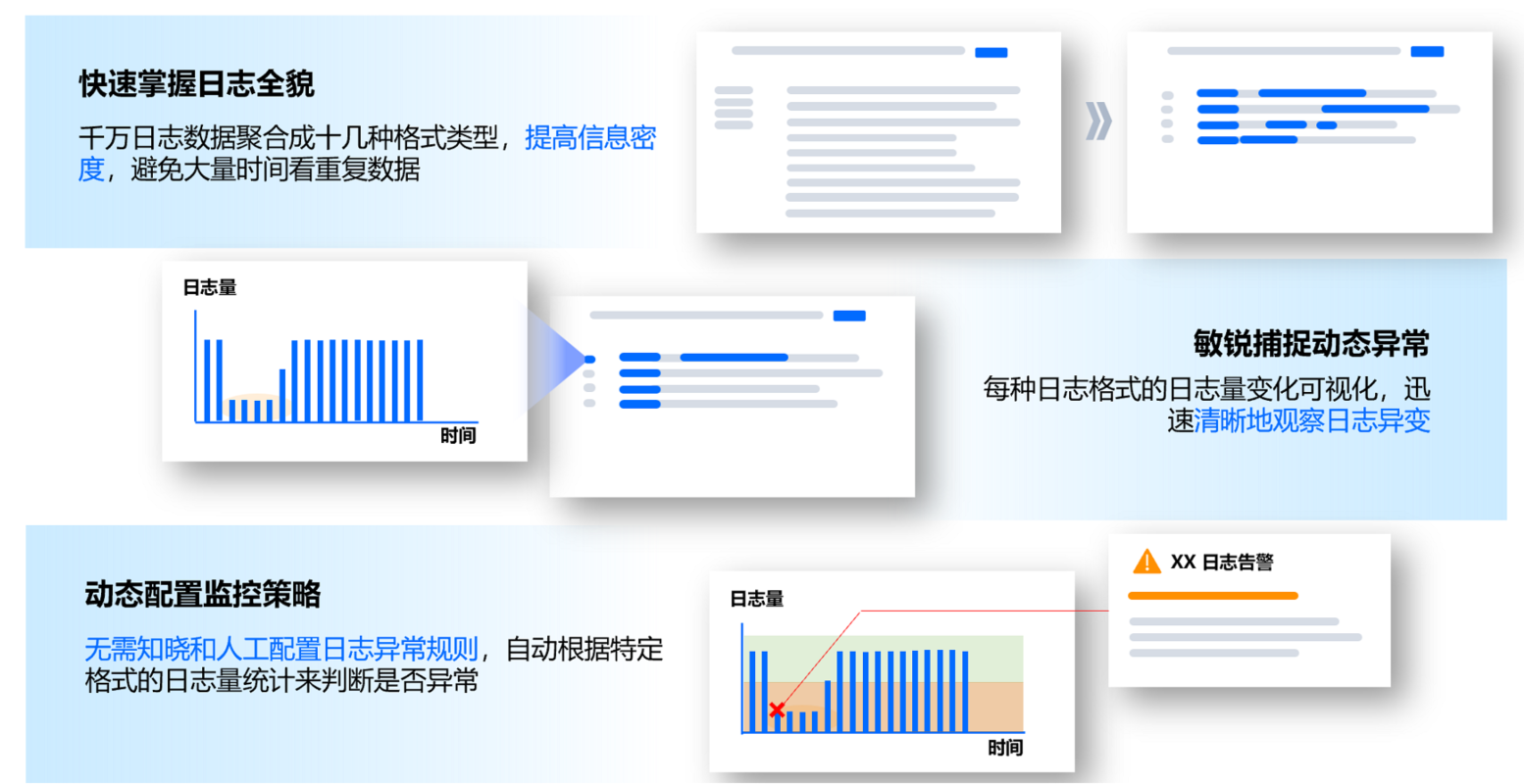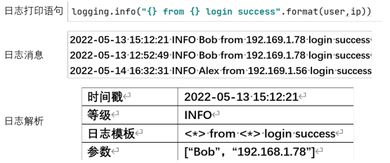 3. 便于处理:解析后的日志可以更轻松地进行大规模处理,转化为对模板和参数的分析,避免对原始无结构化日志进行复杂的分析,可方便供下游日志异常检测使用。