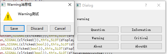 switch (QMessageBox::warning(this,"Warning消息框","Warning测试",QMessageBox::Save|QMessageBox::Discard|QMessageBox::Cancel,QMessageBox::Save)) {