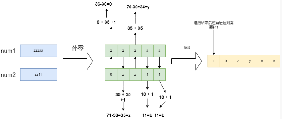 toNumber方法得到对应数字2.相加两个数字,小于36不进位,carry赋值为0,通过getCharValue方法获取对应的36进制表示形式3.大于36进位,carry赋值为1,然后getCharValue方法获取36进制表示形式4.注意相加两个数字时要加上carry - for循环结束后,如果carry>0代表还有进位发生,需要在结果字符串首部插入字符1。因为进位最多只可能进1位,不可能进2位。