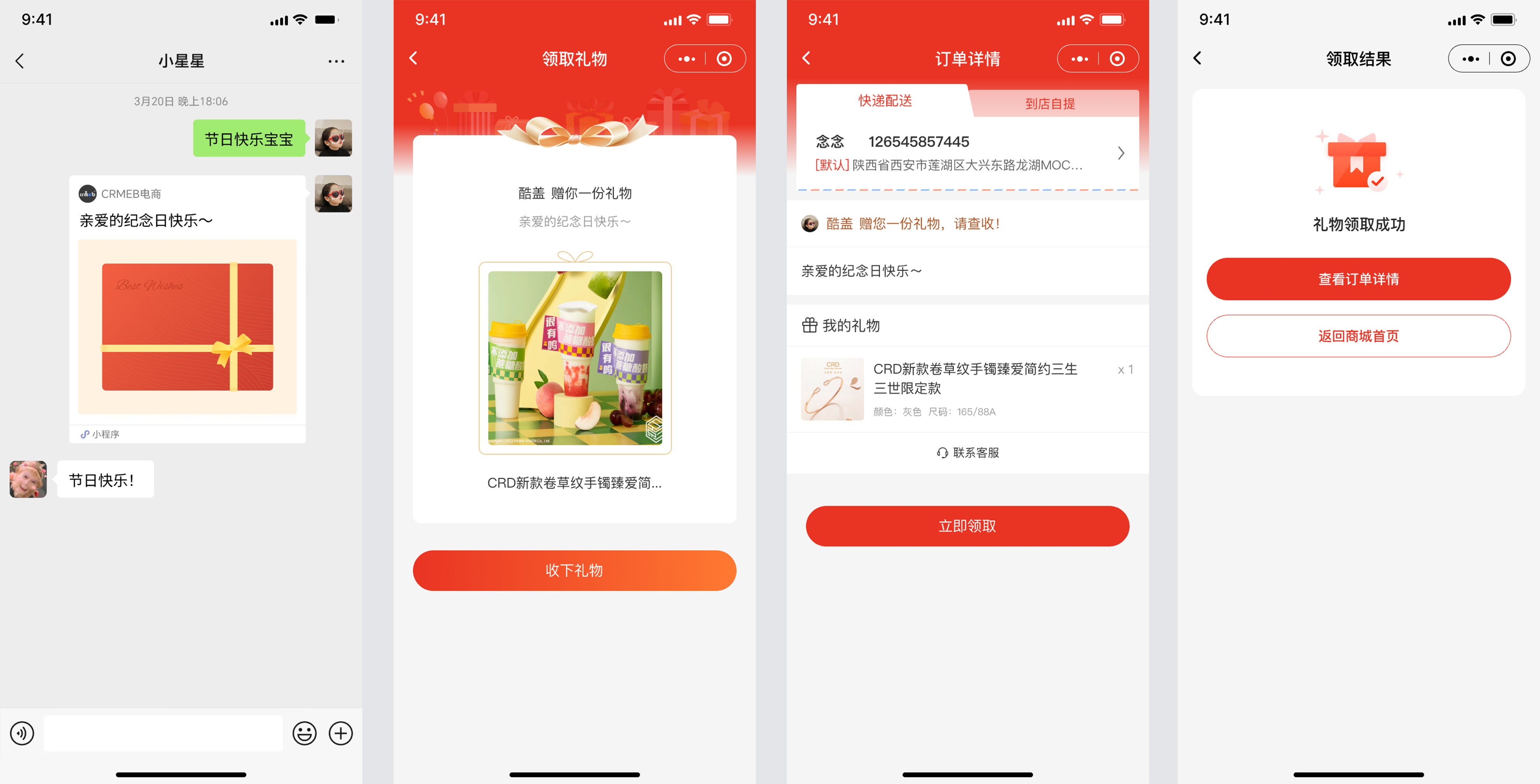 收礼人在收到的分享礼物页面,点击领取,填写收货信息并提交订单,就能顺利领取礼物,收获惊喜。
