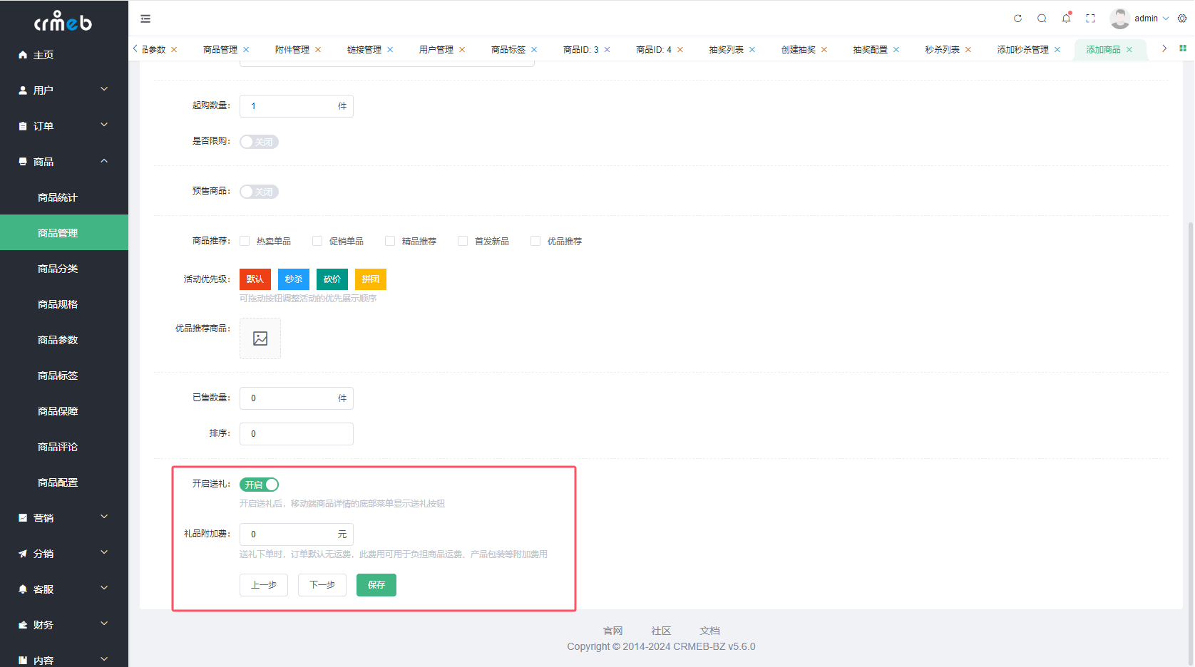 商家在添加/编辑商品时,在【营销设置】中开启商品的送礼功能。