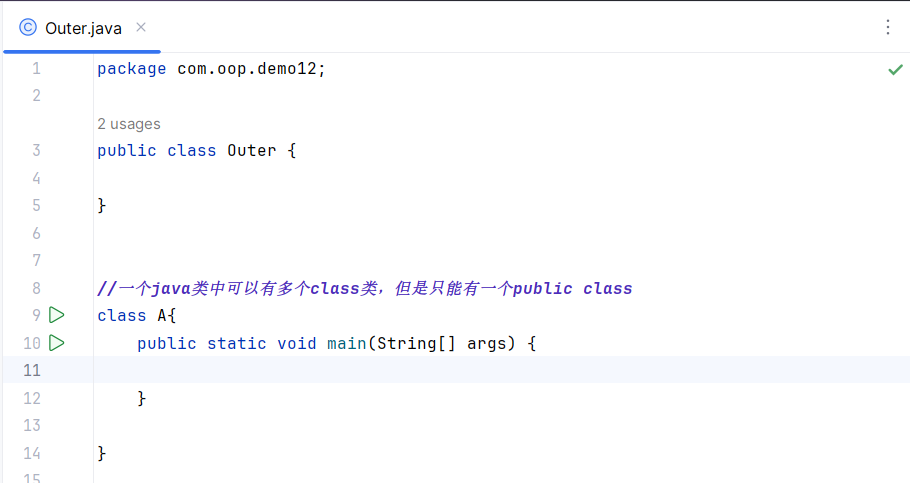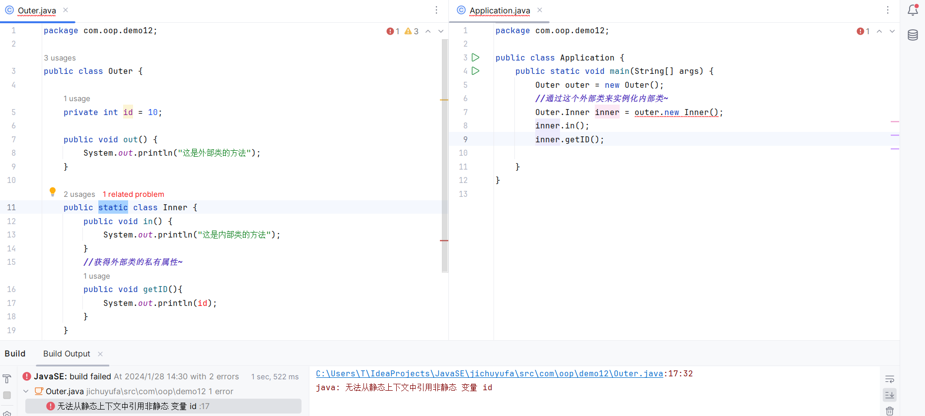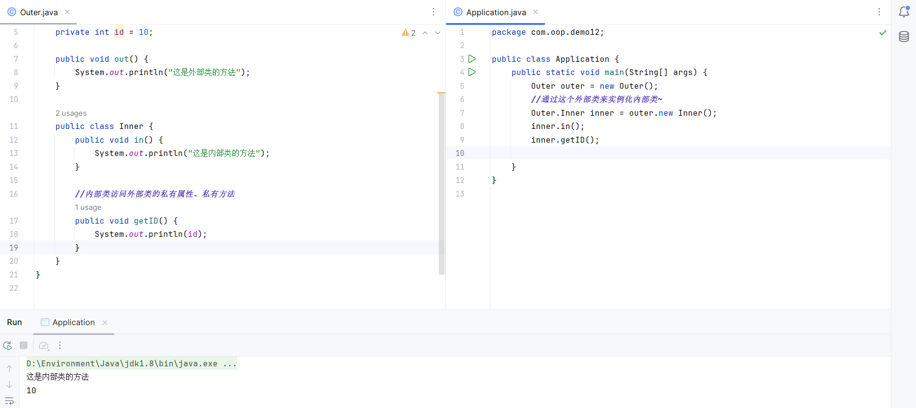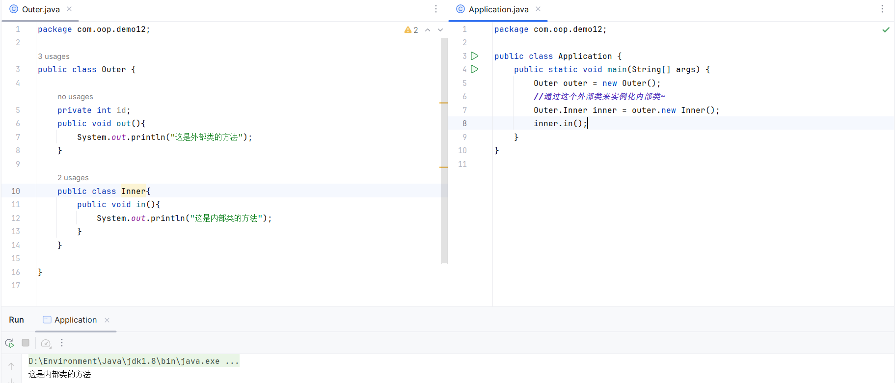 并且注意 要在Application中调用内部类的方法 需要先new外部类Outer 通过外部类的对象outer来new内部类