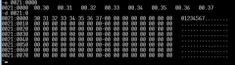 使用e命令修改 0021:0~0021:7数据,将连续8个字节改为30H, 31H, 32H, 33H,34H,35H,36H,37H