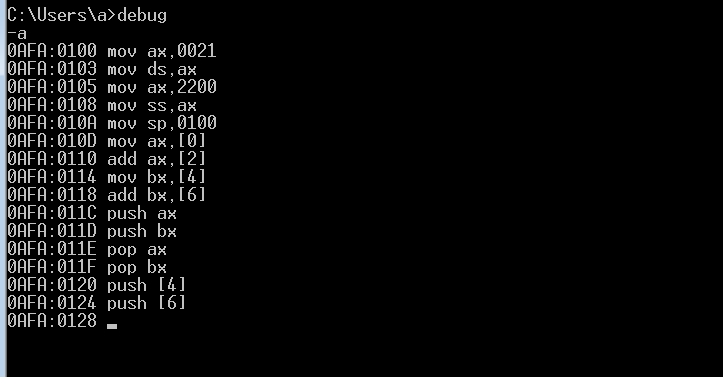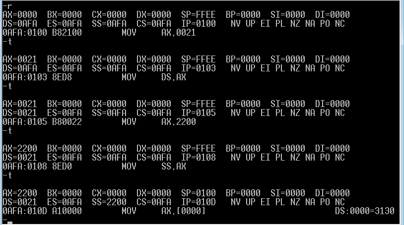 (1)使用debug,将下面的程序段写入内存,逐条执行