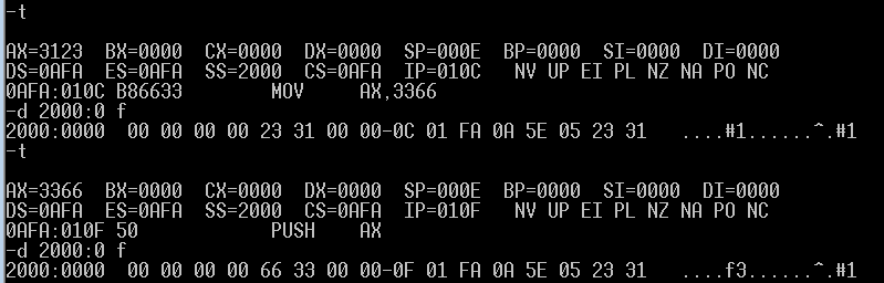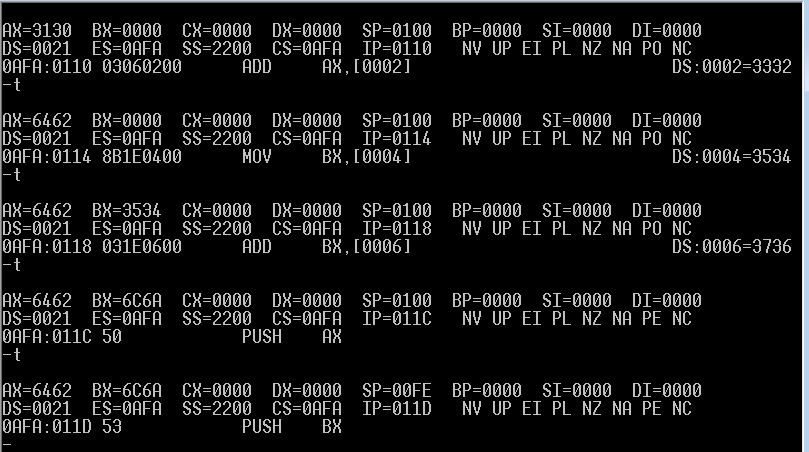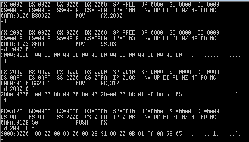 并用t命令逐条执行,同时用d命令查看内存中的内容