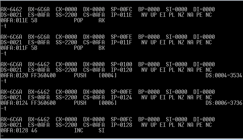 push ax ;sp=00FEH; 修改内存单元地址是2200:FE,内容为6462H