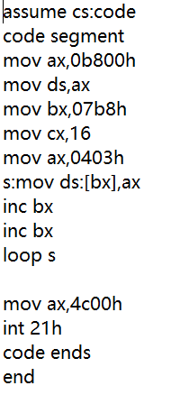 一、综合使用 loop,[bx],编写完整汇编程序,实现向内存 b800:07b8 开始的连续16个字单元重复填充字数据 0403H