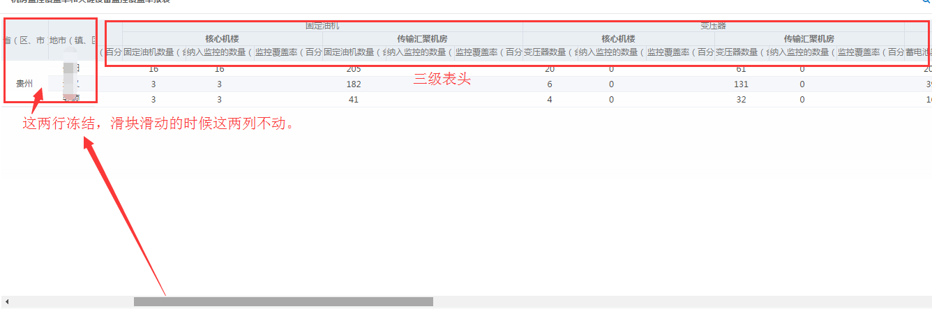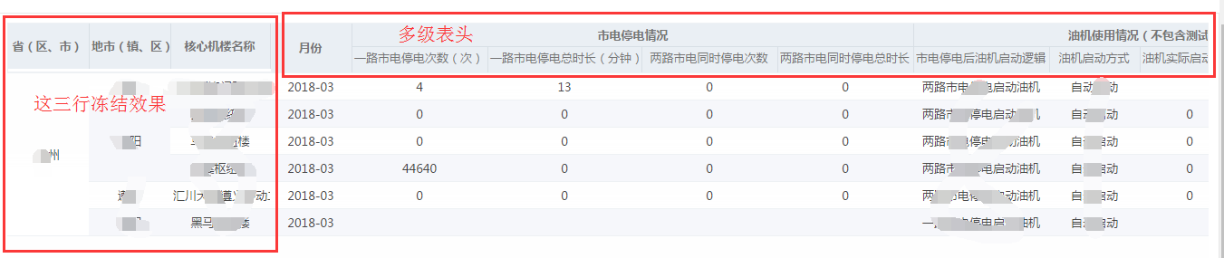 //初始化所有grid function initAllGrid(){ var colModel = [{label:'省(区、市)',name:'provice',index:'provice', width:90,align:"center",frozen:true, cellattr: function(rowId, tv, rawObject, cm, rdata) { //合并单元格 return 'id=\'provice' + rowId + "\'"; } },{label:'地市(镇、区)',name:'area_name',index:'area_name', width:90, align:"center",frozen:true, cellattr: function(rowId, tv, rawObject, cm, rdata) { //合并单元格 return 'id=\'area_name' + rowId + "\'"; } },{label:'核心机楼名称',name:'csb_name',index:'csb_name', width:110,align:"center",frozen:true },{label:'月份',name:'time_id',index:'time_id', width:90, align:"center" },//市电停电情况 {label:'一路市电停电次数(次)',name:'ac1_pf_times',index:'ac1_pf_times', width:150, align:"center" },{label:'一路市电停电总时长(分钟)',name:'ac1_pf_duration',index:'ac1_pf_duration', width:170, align:"center" },{label:'两路市电同时停电次数',name:'ac2_pf_times',index:'ac2_pf_times', width:150, align:"center" },{label:'两路市电同时停电总时长(分钟)',name:'ac2_pf_duration',index:'ac2_pf_duration', width:150, align:"center" },//油机使用情况(不包含测试) {label:'市电停电后油机启动逻辑',name:'oe_startup_logic',index:'oe_startup_logic', width:150,align:"center" },{label:'油机启动方式',name:'oe_startup',index:'oe_startup', width:100, align:"center" },{label:'油机实际启动次数(次)',name:'oe_startup_times',index:'oe_startup_times', width:110, align:"center" },{label:'油机实际启动总时长(分钟)',name:'oe_startup_duration',index:'oe_startup_duration', width:150, align:"center" },//最长时长统计 {label:'一路市电停电单次最大时长(分钟)',name:'ac1_pf_duration_per',index:'ac1_pf_duration_per', width:230, align:"center" },{label:'两路市电停电单次最大时长(分钟)',name:'ac2_pf_duration_per',index:'ac2_pf_duration_per', width:220, align:"center" },{label:'油机带载单次最大时长(分钟)',name:'oe_load_duration_per',index:'oe_load_duration_per', width:210, align:"center" },{label:'蓄电池组单次放电最大时长(分钟)',name:'bat_discharge_duration_per',index:'bat_discharge_duration_per', width:230, align:"center" },//蓄电池放电情况统计 {label:'蓄电池组放电次数(组.次)',name:'bat_discharge_times',index:'bat_discharge_times', width:190, align:"center" },{label:'蓄电池组放电总时长(组.分钟)',name:'bat_discharge_duration',index:'bat_discharge_duration', width:190, align:"center" }, {label:'交流系统可用度',name:'acs_avail',index:'acs_avail', width:100, align:"center" },{label:'直流系统可用度',name:'dcs_avail',index:'dcs_avail', width:100, align:"center" }]; _initGrid('con_grid_div_grid',colModel,470,15); } //初始化grid的方法 function _initGrid(gridType,colModel,height,rownum){// var me = this; $("#"+gridType).jqGrid({ height: height, rowNum : rownum, scrollOffset :0, datatype: "local", colModel:colModel, autowidth : false, shrinkToFit : false, autoScroll: true, pager: "#"+gridType+"Pager", gridComplete: function() { //②在gridComplete调用合并方法 var gridName = gridType; Merger(gridName, 'provice'); Merger(gridName, 'area_name'); } }); //公共调用方法 function Merger(gridName, CellName) { //得到显示到界面的id集合 var mya = $("#" + gridName + "").getDataIDs(); //当前显示多少条 var length = mya.length; for (var i = 0; i < length; i++) { //从上到下获取一条信息 var before = $("#" + gridName + "").jqGrid('getRowData', mya[i]); //定义合并行数 var rowSpanTaxCount = 1; for (j = i + 1; j <= length; j++) { //和上边的信息对比 如果值一样就合并行数+1 然后设置rowspan 让当前单元格隐藏 var end = $("#" + gridName + "").jqGrid('getRowData', mya[j]); if (before[CellName] == end[CellName]) { rowSpanTaxCount++; $("#" + gridName + "").setCell(mya[j], CellName, '', { display: 'none' }); } else { rowSpanTaxCount = 1; break; } $("#" + CellName + "" + mya[i] + "").attr("rowspan", rowSpanTaxCount); } } } $("#"+gridType).jqGrid('setGroupHeaders',{ useColSpanStyle: true, groupHeaders:[ {startColumnName : 'ac1_pf_times',numberOfColumns : 4,titleText : '市电停电情况'}, {startColumnName : 'oe_startup_logic',numberOfColumns : 4,titleText : '油机使用情况(不包含测试)'}, {startColumnName : 'ac1_pf_duration_per',numberOfColumns : 4,titleText : '最长时长统计'}, {startColumnName : 'bat_discharge_times',numberOfColumns : 2,titleText : '蓄电池放电情况统计'} ] }); $("#"+gridType).jqGrid('setFrozenColumns');//滑动时此列冻结设置 }