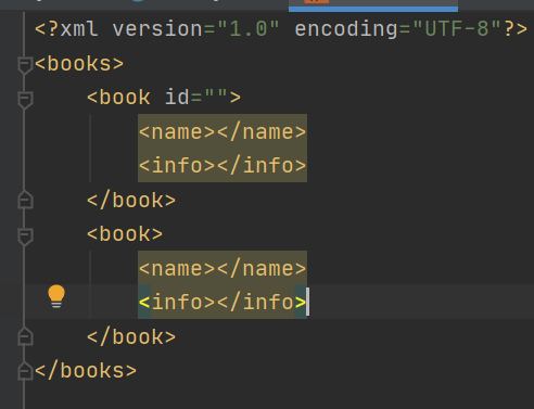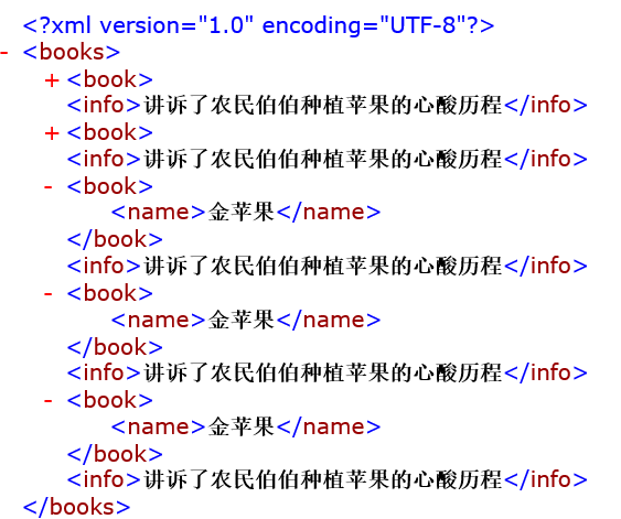 1 import org.dom4j.Document; 2 import org.dom4j.DocumentHelper; 3 import org.dom4j.Element; 4 import org.dom4j.io.XMLWriter; 5 6 import java.io.*; 7 8 public class Demo05 { 9 public static void main(String[] args) throws IOException { 10 //1 通过文档帮助器 (DocumentHelper) , 创建空的文档对象 11 Document doc = DocumentHelper.createDocument(); 12 //2 通过文档对象, 向其中添加根节点 13 Element books = doc.addElement("books"); 14 for(int i = 0;i<5;i++){ 15 //3 通过根节点对象root , 丰富我们的子节点 16 Element book = books.addElement("book"); 17 Element name = book.addElement("name"); 18 Element info = books.addElement("info"); 19 name.setText("金苹果"); 20 info.setText("讲诉了农民伯伯种植苹果的心酸历程"); 21 } 22 //4 创建一个文件输出流 ,用于存储XML文件 23 FileOutputStream os = new FileOutputStream("D://books.xml"); 24 //5 将文件输出流, 转换为XML文档输出流 25 XMLWriter xw = new XMLWriter(os); 26 //6 写出文档 27 xw.write(doc); 28 xw.close(); 29 } 30 }