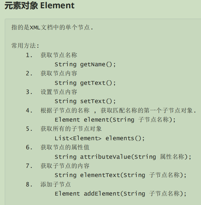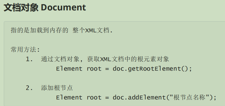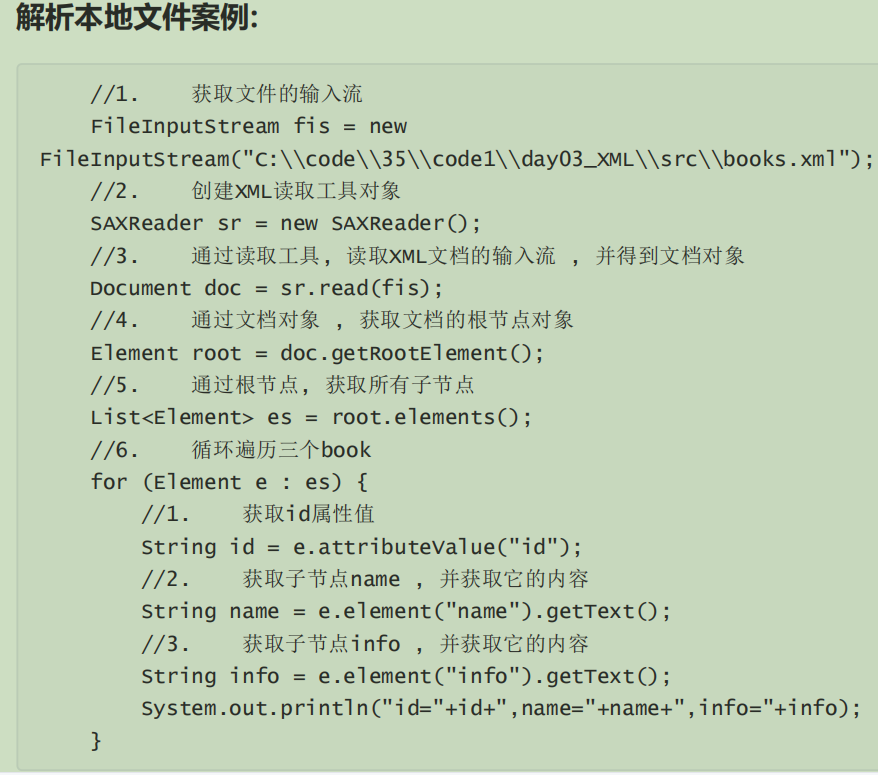 1 import org.dom4j.Document; 2 import org.dom4j.DocumentException; 3 import org.dom4j.Element; 4 import org.dom4j.io.SAXReader; 5 6 import java.io.FileInputStream; 7 8 import java.io.IOException; 9 10 public class Demo01 { 11 public static void main(String[] args) throws IOException, DocumentException { 12 //1.获取文件输入流 13 FileInputStream fis = new FileInputStream("D://book.xml"); 14 //2.创建xml文件读取对象 15 SAXReader reader = new SAXReader(); 16 //3 读取并得到文档对象 17 Document doc = reader.read(fis); 18 //4 获取文档根元素 19 Element root = doc.getRootElement(); 20 //5 获取根元素的名字 21 System.out.println(root.getName());