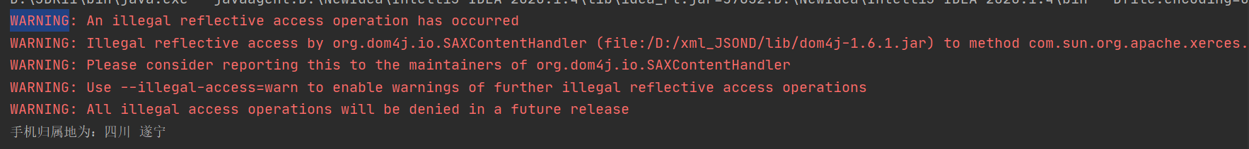 1 import org.dom4j.Document; 2 import org.dom4j.DocumentException; 3 import org.dom4j.Element; 4 import org.dom4j.io.SAXReader; 5 6 import java.io.IOException; 7 import java.io.InputStream; 8 import java.io.InputStreamReader; 9 import java.net.MalformedURLException; 10 import java.net.URL; 11 import java.net.URLConnection; 12 13 public class Demo02 { 14 public static void main(String[] args) throws IOException, DocumentException { 15 String phone = "*****";//此处为正确形态的电话号码,可根据个人号码来填充。 16 //1 获取到XML资源的输入流 17 URL url = new URL("http://apis.juhe.cn/mobile/get? phone="+phone+"&dtype=xml&key=9f3923e8f87f1ea50ed4ec8c39cc9253"); 18 URLConnection conn = url.openConnection(); 19 InputStream is = conn.getInputStream(); 20 //2 创建一个XML读取对象 21 SAXReader reader = new SAXReader(); 22 //3 通过读取对象,读取XML数据,并返回文档对象 23 Document doc = reader.read(is); 24 //4 获取根节点 25 Element root = doc.getRootElement(); 26 //5 解析内容 27 String code = root.elementText("resultcode");//获取根节点的内容 28 if(code.equals("200")){ 29 Element result = root.element("result");//获取root的子元素 30 String province = result.elementText("province");//子元素的内容 31 String city = result.elementText("city"); 32 if(province.equals(city)){ 33 System.out.println("手机归属地为:"+city); 34 }else{ 35 System.out.println("手机归属地为:"+province+" "+city); 36 } 37 }else{ 38 System.out.println("请正确输入手机号"); 39 } 40 41 42 } 43 }