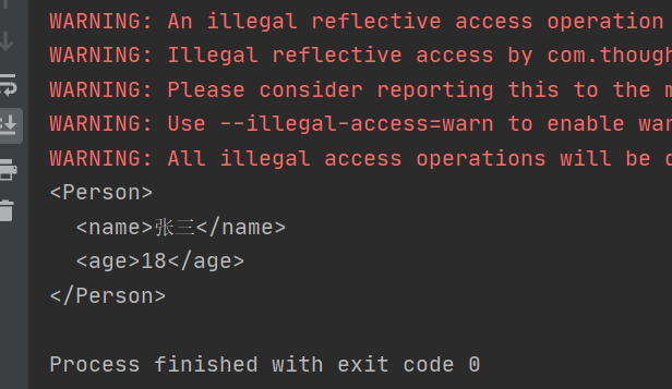 1 import com.thoughtworks.xstream.XStream; 2 3 import java.util.Objects; 4 5 public class Demo06 { 6 public static void main(String[] args) { 7 8 Person p = new Person(); 9 p.setName("张三"); 10 p.setAge(18); 11 //XStream使用 12 //1 创建XStream对象 13 XStream xStream = new XStream(); 14 //2 修改类生成的节点名称 (默认节点名称为 包名.类名) 15 xStream.alias("Person",Person.class); 16 //3 传入对象 , 生成XML字符串 17 String s = xStream.toXML(p); 18 System.out.println(s); 19 20 } 21 static class Person{ 22 private String name; 23 private int age; 24 public Person(){}; 25 26 public String getName() { 27 return name; 28 } 29 30 public void setName(String name) { 31 this.name = name; 32 } 33 34 public int getAge() { 35 return age; 36 } 37 38 public void setAge(int age) { 39 this.age = age; 40 } 41 42 @Override 43 public boolean equals(Object o) { 44 if (this == o) return true; 45 if (o == null || getClass() != o.getClass()) return false; 46 Person person = (Person) o; 47 return age == person.age && 48 Objects.equals(name, person.name); 49 } 50 51 @Override 52 public int hashCode() { 53 return Objects.hash(name, age); 54 } 55 56 @Override 57 public String toString() { 58 return "Person{" + 59 "name='" + name + '\'' + 60 ", age=" + age + 61 '}'; 62 } 63 } 64 }