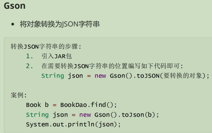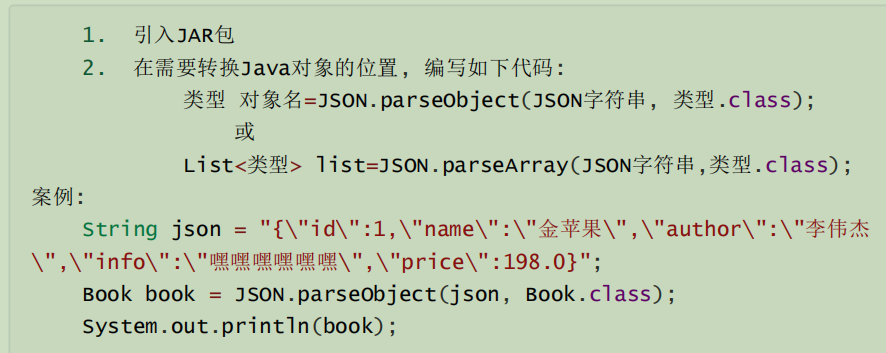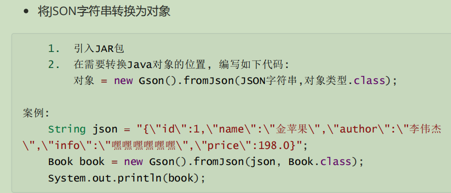 1 import com.google.gson.Gson; 2 3 public class Demo02 { 4 public static void main(String[] args) { 5 //1 创建JSON对象 6 7 //将字符串转化为图书的类型 8 Book book = new Gson().fromJson("{\"id\":\"100\",\"name\":\"金苹果\",\"info\":\"种植金苹果\"}", Book.class); 9 System.out.println(book.getId()); 10 } 11 }