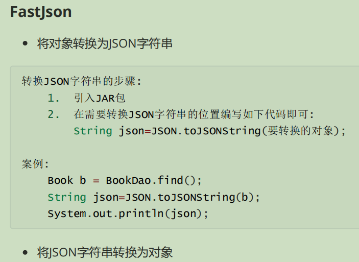 1 import com.alibaba.fastjson.JSON; 2 3 import java.util.List; 4 5 public class Demo05 { 6 public static void main(String[] args) { 7 //{"id":"100","info":"种植金苹果","name":"金苹果"} 8 //1.将字符串转换为对象 9 Book book = JSON.parseObject("{\"id\":\"100\",\"info\":\"种植金苹果\",\"name\":\"金苹果\"}", Book.class); 10 System.out.println(book.getId());//100 11 //2.将字符串转换为数组["床前明月光","地上鞋一堆","床上我宝川","大喊十块钱一双"] 12 List<String> list = JSON.parseArray("[\"床前明月光\",\"地上鞋一堆\",\"床上我宝川\",\"大喊十块钱一双\"]", String.class); 13 System.out.println(list.get(1)); 14 } 15 }