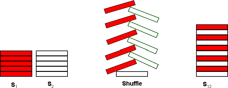 After the shuffle operation, S12 is split into 2 new stacks by taking the bottommost C chips from S12 to form a new S1 and the topmost C chips from S12 to form a new S2. The shuffle operation may then be repeated to form a new S12.