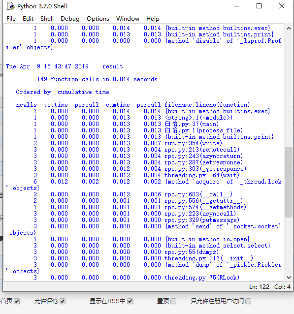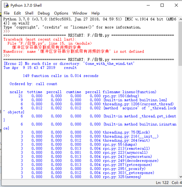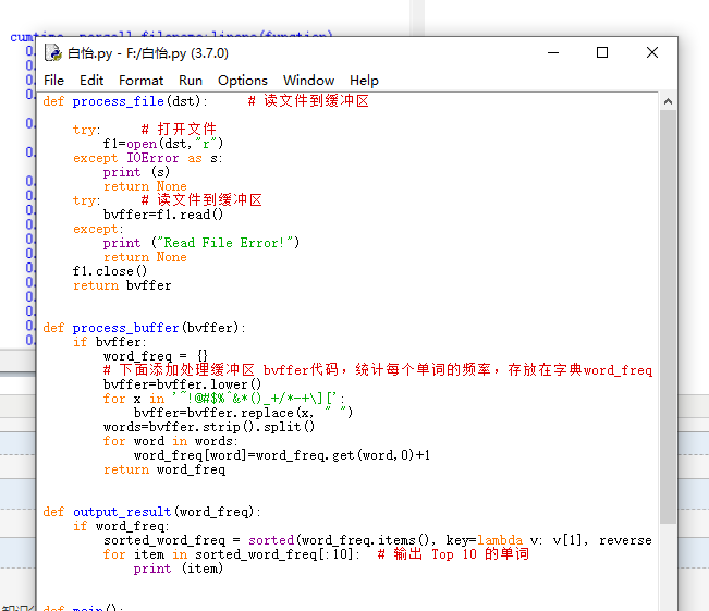 def process_file(dst): # 读文件到缓冲区 try: # 打开文件 f1=open(dst,"r") except IOError as s: print (s) return None try: # 读文件到缓冲区 bvffer=f1.read() except: print ("Read File Error!") return None f1.close() return bvffer def process_buffer(bvffer): if bvffer: word_freq = {} # 下面添加处理缓冲区 bvffer代码,统计每个单词的频率,存放在字典word_freq bvffer=bvffer.lower() for x in '~!@#$%^&*()_+/*-+\][': bvffer=bvffer.replace(x, " ") words=bvffer.strip().split() for word in words: word_freq[word]=word_freq.get(word,0)+1 return word_freq def output_result(word_freq): if word_freq: sorted_word_freq = sorted(word_freq.items(), key=lambda v: v[1], reverse=True) for item in sorted_word_freq[:10]: # 输出 Top 10 的单词 print (item) def main(): dst = "Gone_with_the_wind.txt" bvffer = process_file(dst) word_freq = process_buffer(bvffer) output_result(word_freq) if __name__ == "__main__": import cProfile import pstats cProfile.run("main()", "result") # 直接把分析结果打印到控制台 p = pstats.Stats("result") # 创建Stats对象 p.strip_dirs().sort_stats("call").print_stats() # 按照调用的次数排序 p.strip_dirs().sort_stats("cumulative").print_stats() # 按执行时间次数排序