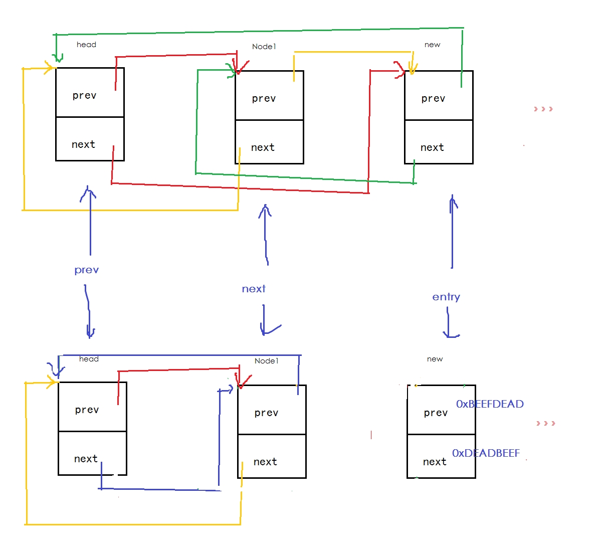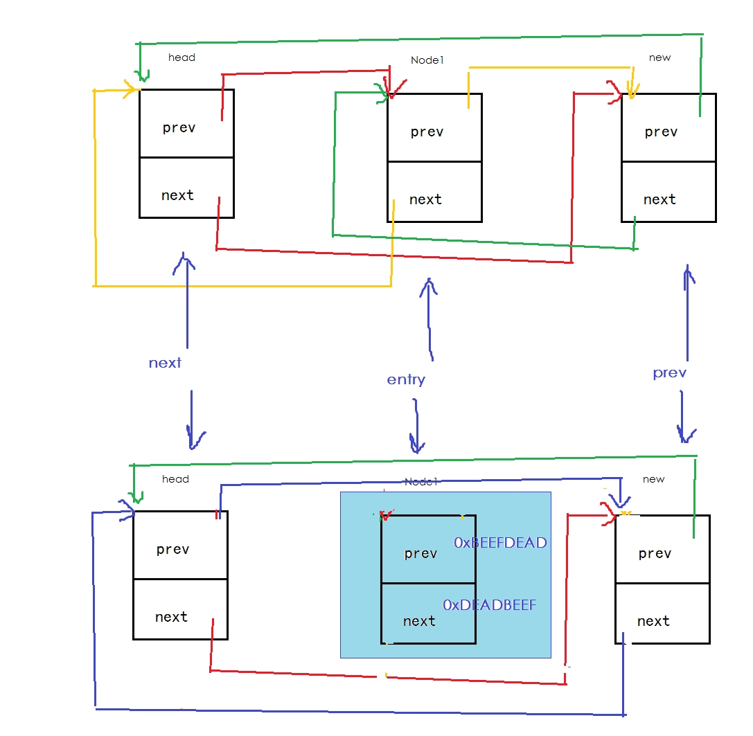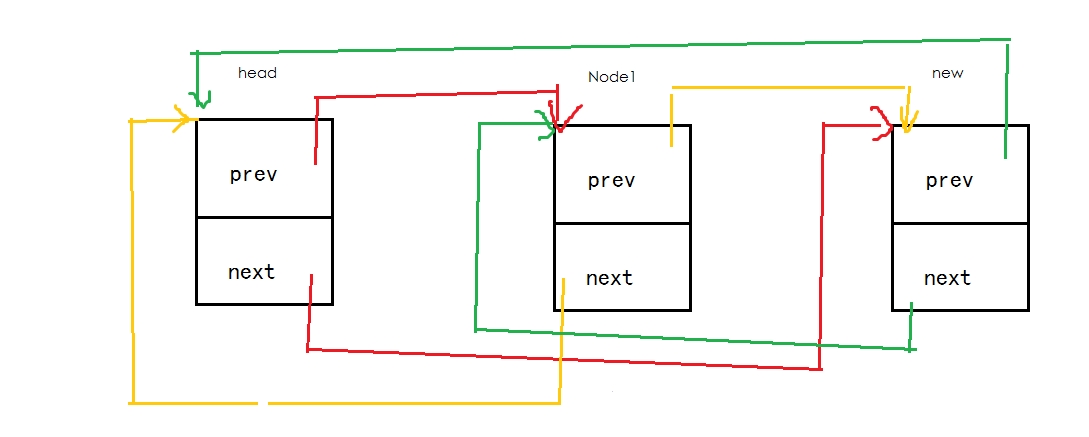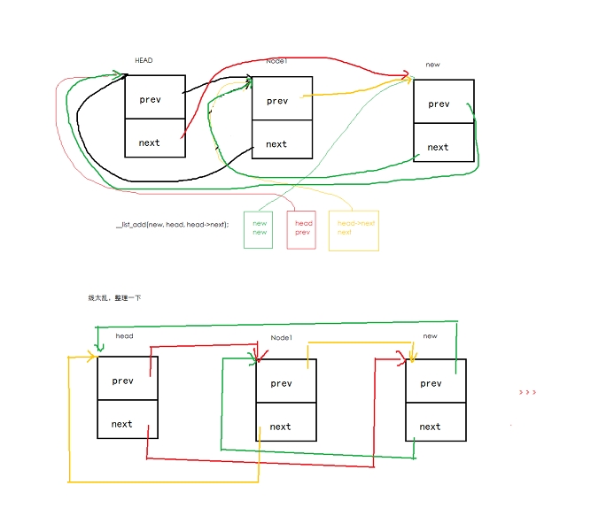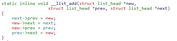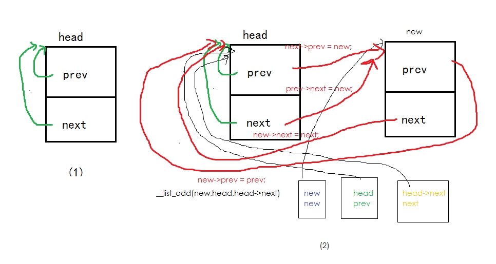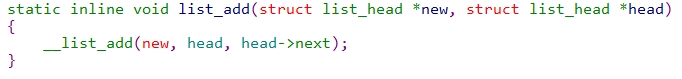 list_add传入new,和head。当head还未加入其它元素的情况下,head->next的值是一个地址,该地址指向head本身: