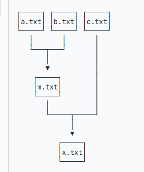 # 执行make,因为m.txt不存在则会执行cat a.txt b.txt > m.txt