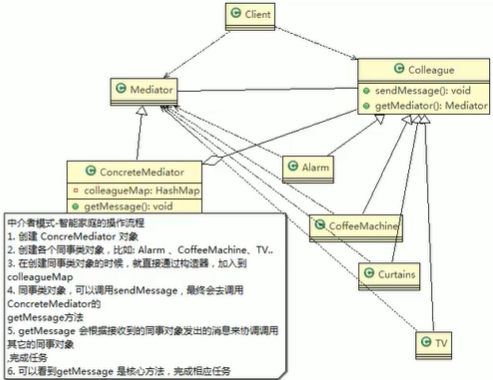 中介者模式(Mediator Pattern),用一个中介对象来封装一系列的对象交互。中介者使各个对象不需要显式地相互引用,从而使其耦合松散,而且可以独立地改变它们之间的交互。