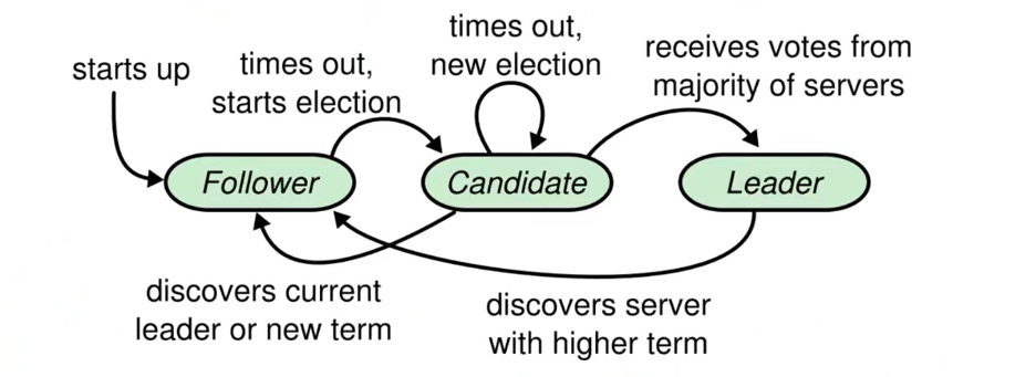 - Raft算法将Server划分为3中状态,或者也可以称作角色: