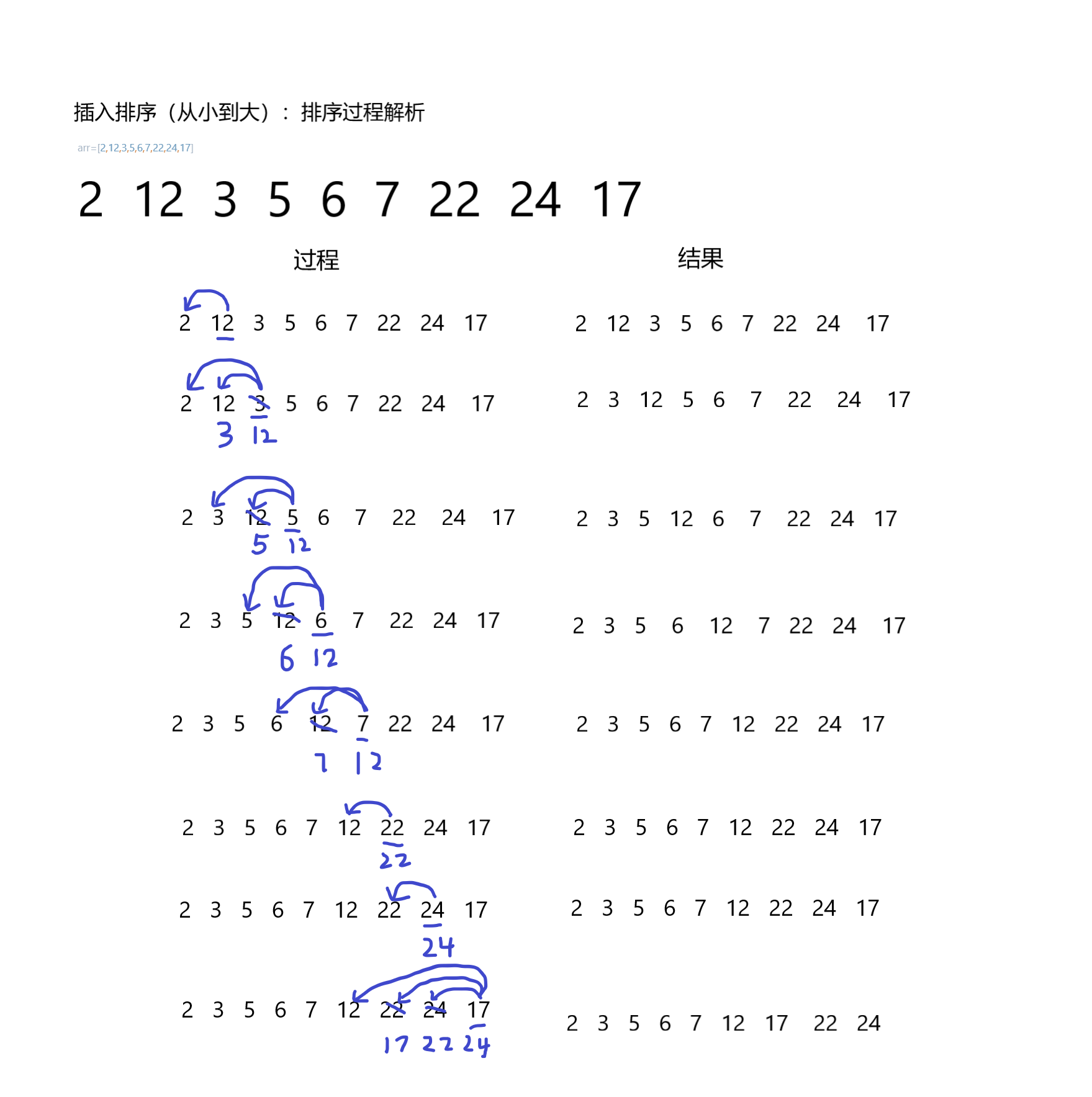 if(currentNum<arr[j-1]): # 当前元素 小于它前面的 那个元素,它前面的那个元素往后移动一位