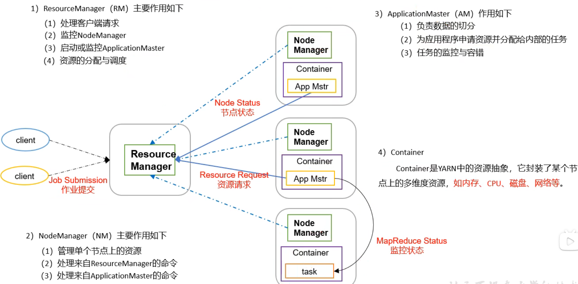 接了个项目(job)-->ResourceManager --(分配负责人)启动--> ApplicationMaster(负责当前的项目(job)) -把控项目-> 项目骑电动,进行开发