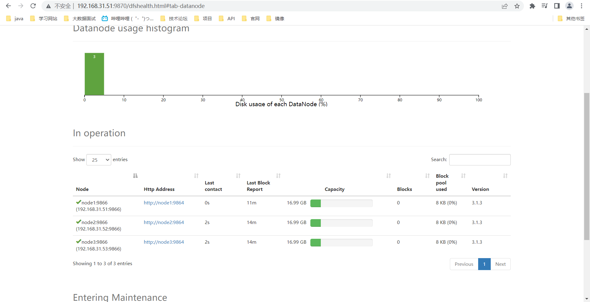 在所有的节点执行:hdfs --daemon start datanode