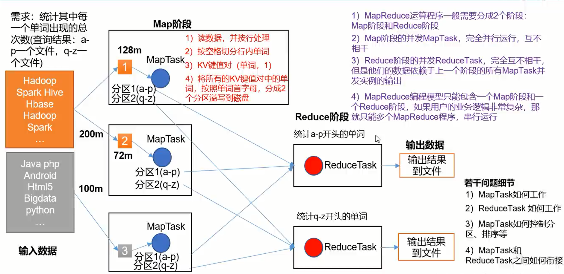 3. 第二阶段的ReduceTask并发实例互不相干,但是他们的数据依赖于上一个阶段的所有MapTask并发实例的输出