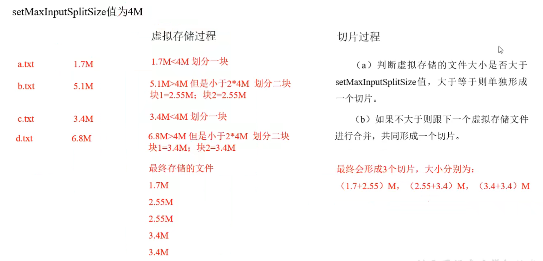 将输入目录下所有文件大小,依次和设置的setMaxInputSplitSize值比较,如果步大于设置的最大值,逻辑上划分一个块。如果输入文件大于设置的最大值且大于两倍,那么以最大值切割一块;当剩余数据大小超过设置的最大值且不大于最大值2倍,此时将文件均分成2个虚拟存储块(防止出现太小切片)