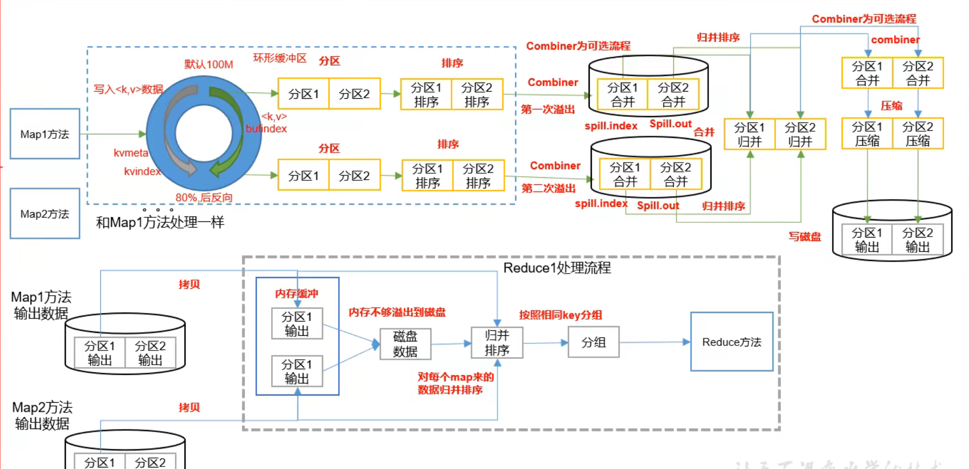 对于MapTask,他会将处理的结果暂时放到环形缓冲区中,当环形缓冲区使用率达到一定阈值后,再对缓冲区中的数据进行依次快速排序,并将这些有序数据溢写到磁盘上,而当数据处理完毕后,他会对磁盘上所有文件进行归并排序