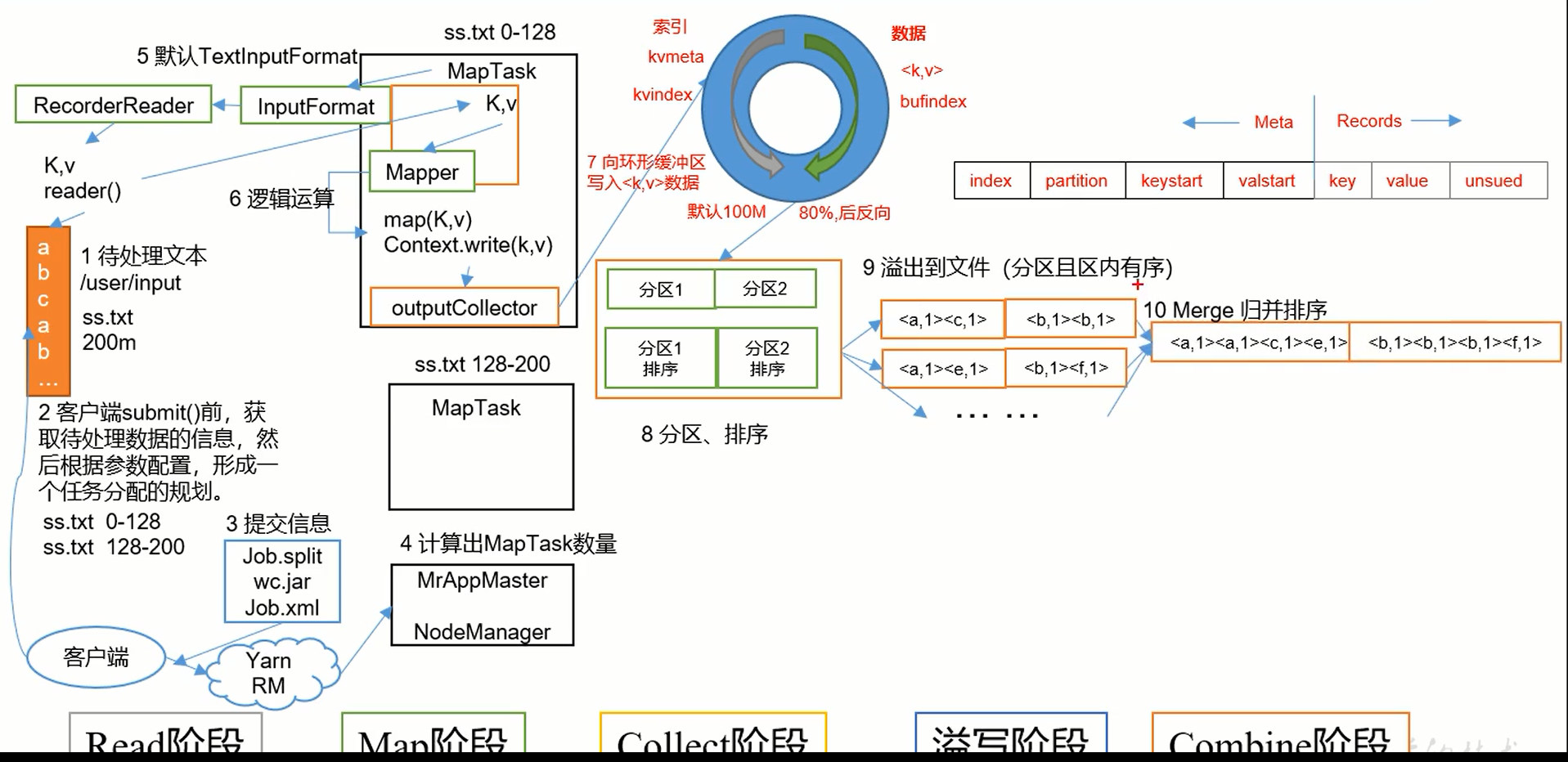 1. Read阶段:MapTask通过用户编写的RecordReader,从输入InputSplit中解析出一个个key/value