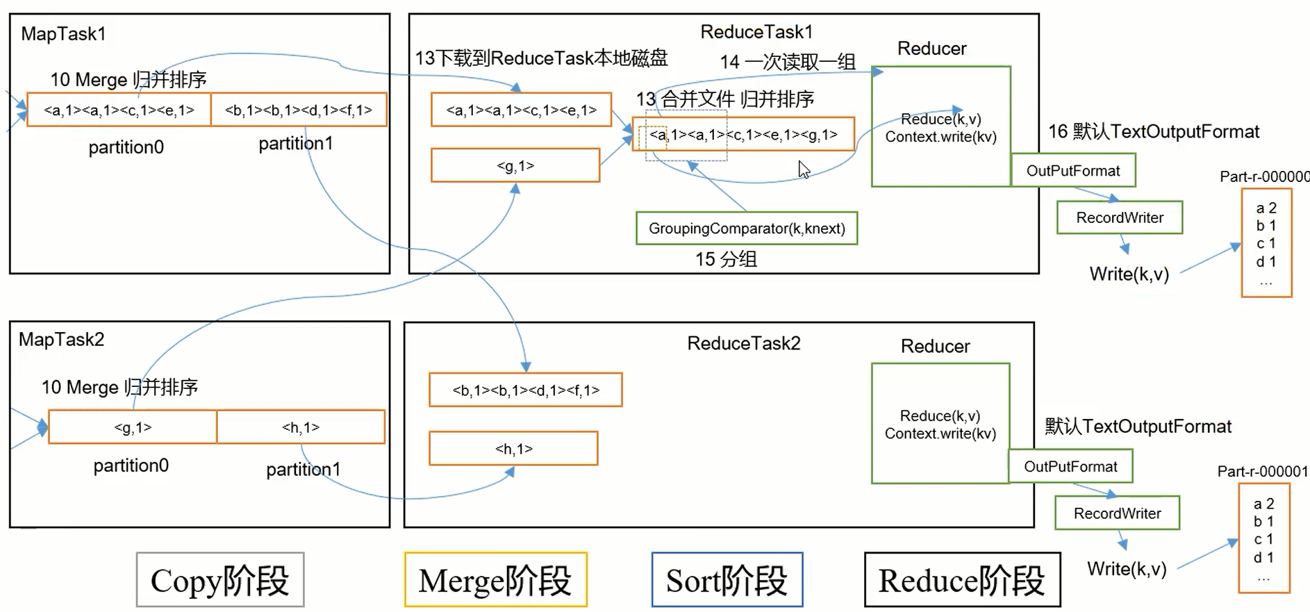 多个ReduceTask是并行执行,根据自身所负责的分组,到每个MapTask中拷贝对应分区的数据