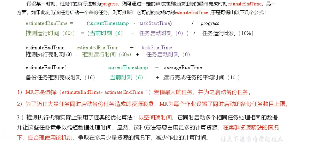 发现拖后腿的任务,比如某个任务运行速度远慢于任务平均速度。为拖后腿任务启动一个备份任务,同时运行。谁先运行完,则采用谁的结果。