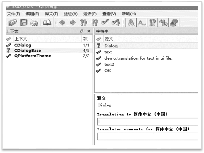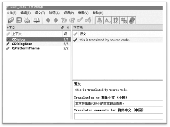 完成全部翻译工作后,可以查看图3-3中【上下文】列表框的内容,检查是否还有未翻译的项目(未翻译的源文前面显示“?”,已翻译的显示√)。完成所有翻译后,将ts文件发布为二进制的qm文件。方法是选择【文件】|【另外发布为】菜单项,然后选择发布目录即可。比如,可以将qm文件发布到 $$(PRJROOT)/system/lang目录下。
