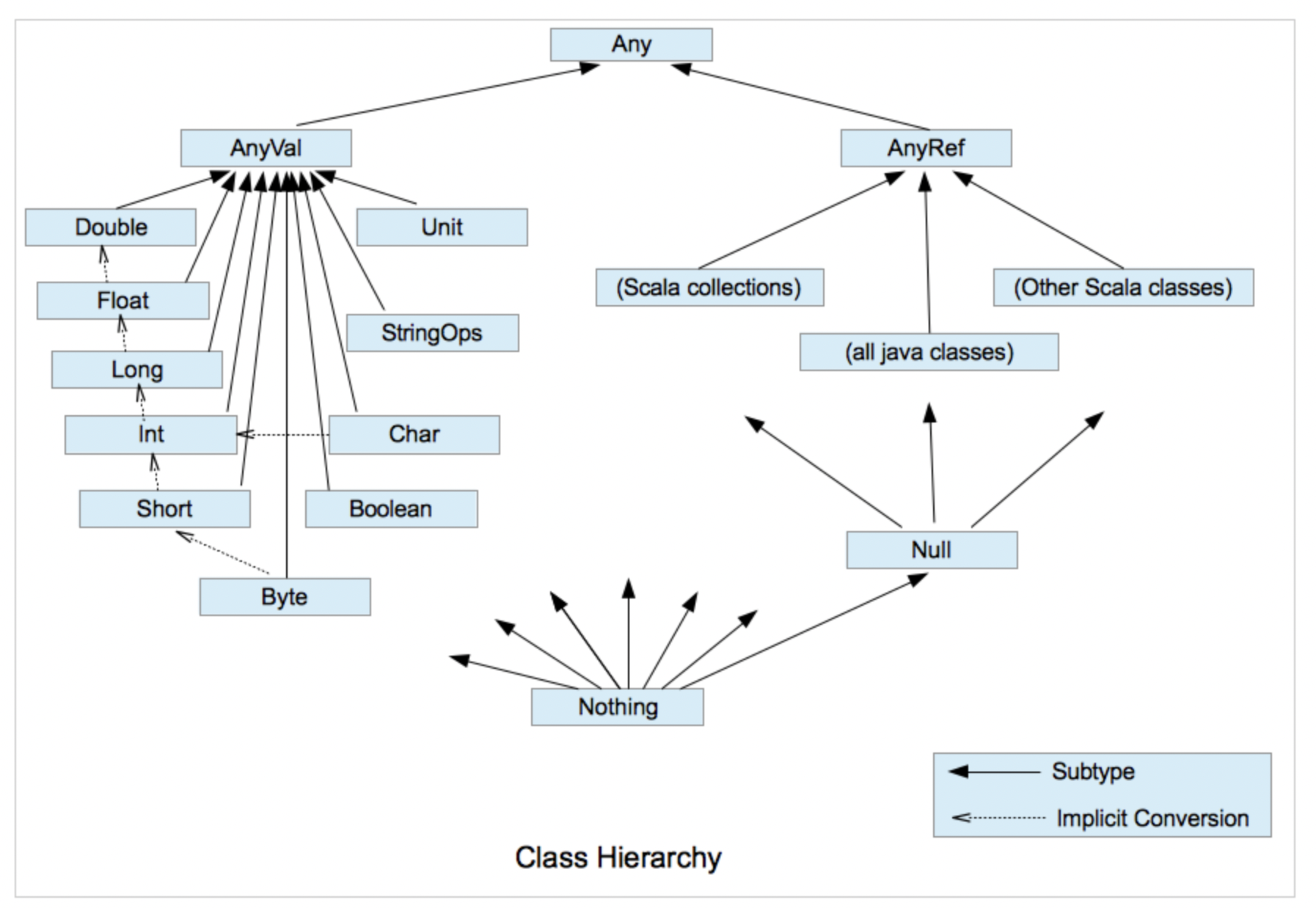 * Scala中所有基本类型都是对象,且都是 Any 的子类