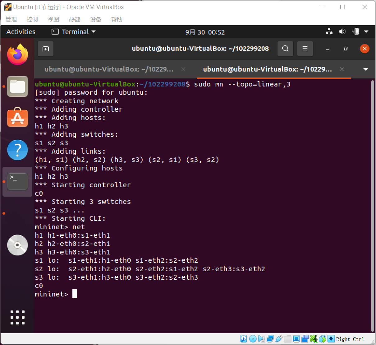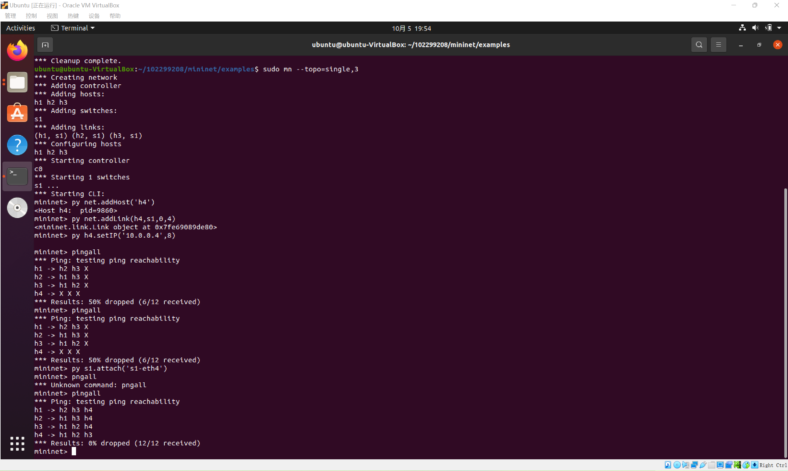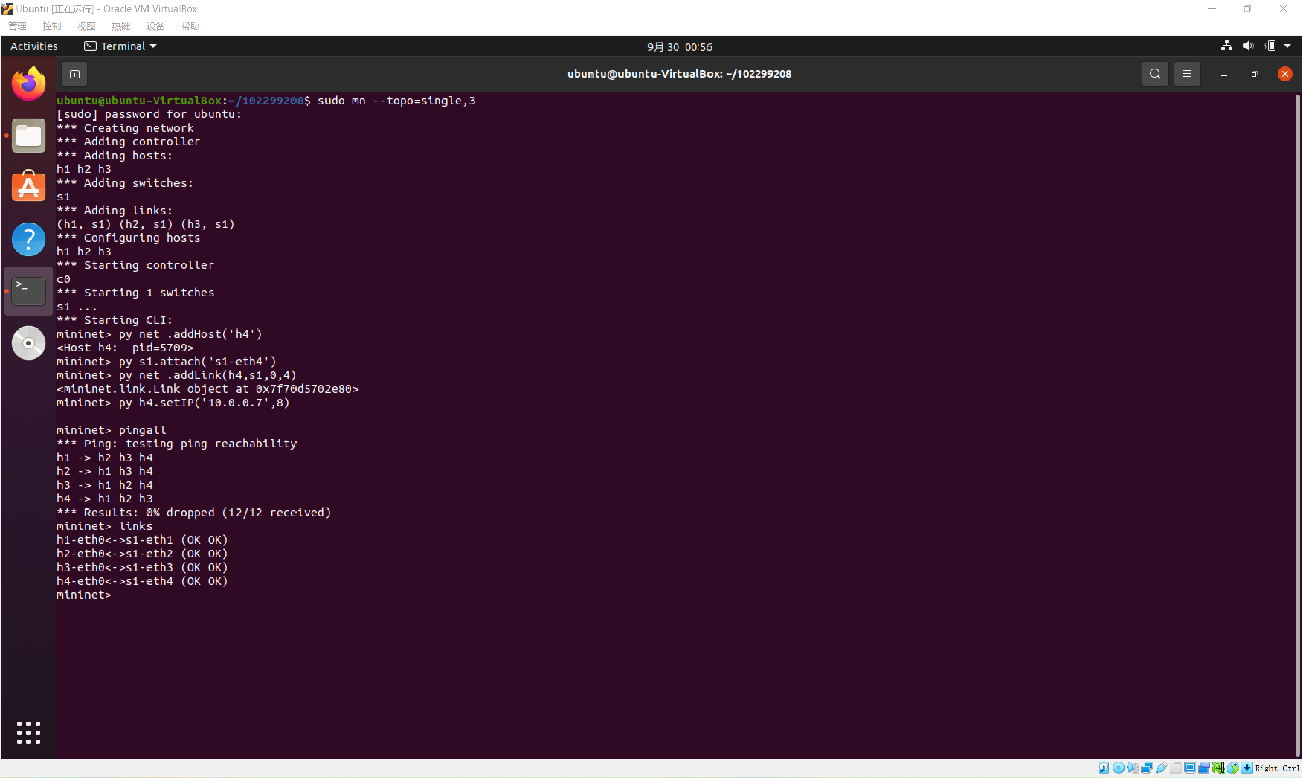3.在2b)的基础上,在Mininet交互界面上新增1台主机并且连接到交换机上,再测试新拓扑的连通性