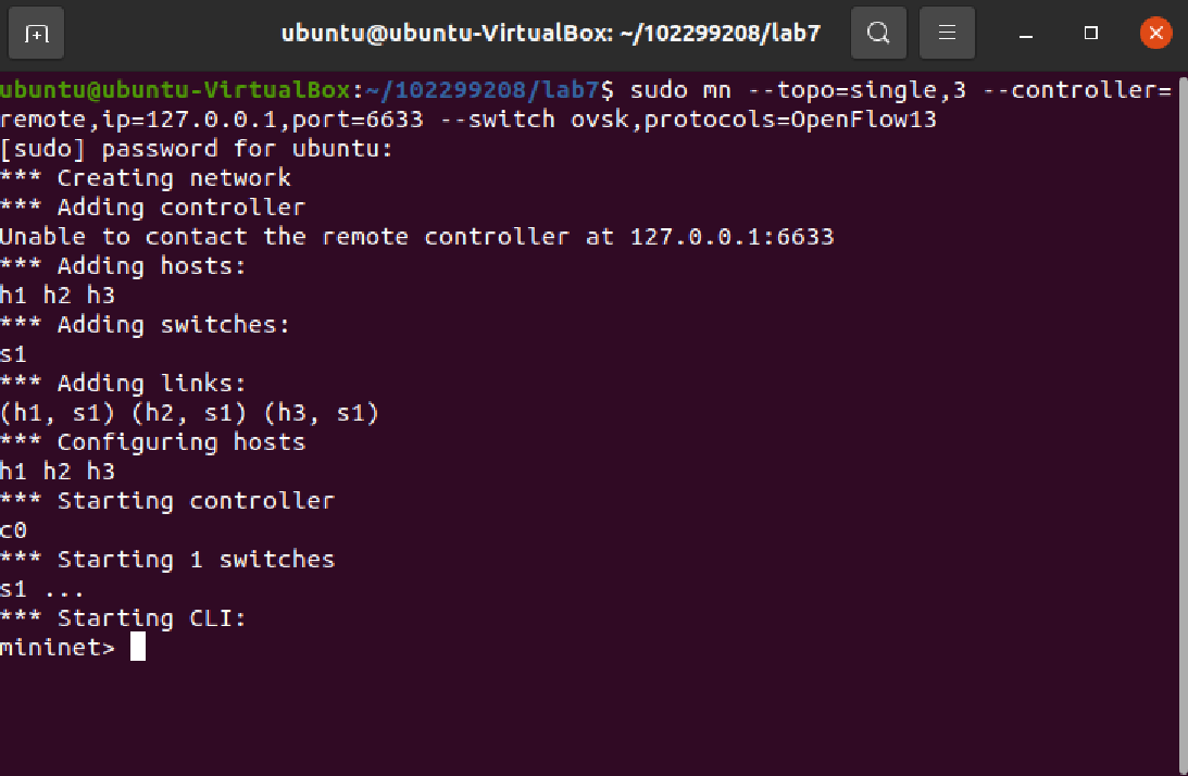 sudo mn --topo=single,3 --mac --controller=remote,ip=127.0.0.1,port=6633 --switch ovsk,protocols=OpenFlow13 -
