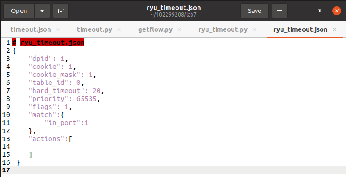 - 创建并编写 ryu_timeout.json 文件