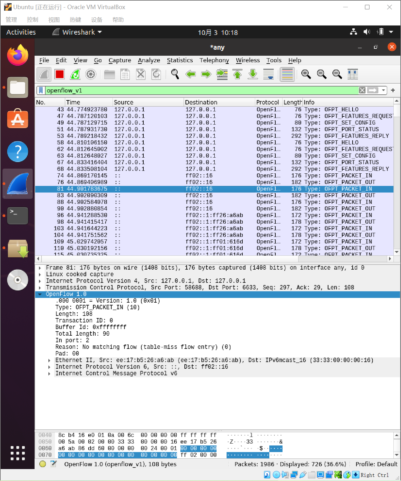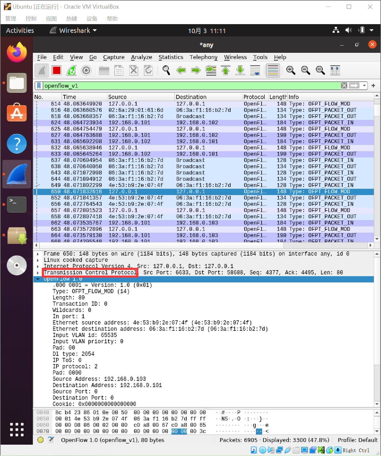 能够借助包解析工具,分析与解释 OpenFlow协议的数据包交互过程与机制。